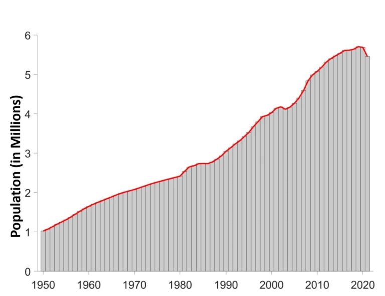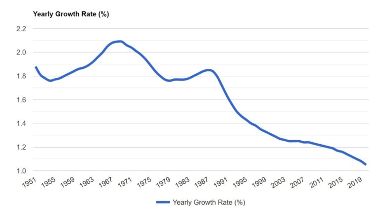The population of Singapore has been increasing at a steady pace from the 50’s. But the trajectory in the last five years is steadily attaining a plateau, with a prominent dip in 2021.