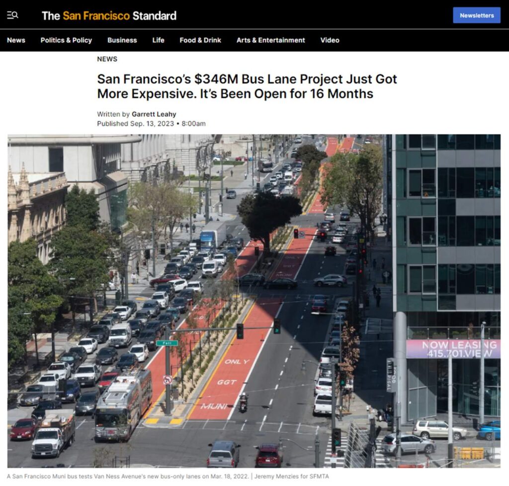 I recently came across the article regarding the Van Ness Bus Rapid Transit Bus Lane in San Francisco. Unfortunately, the project is already 3 years behind schedule and already exceeded its budget by $35 million.