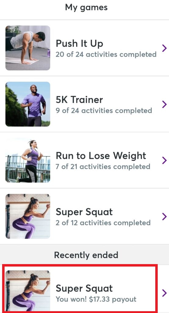 Below is a screenshot of my ongoing games. They are all under Fitness because the pay-out is better there but more effort required. The last pay-out of the game is highlighted at the bottom (red box). I placed $15 USD and received $17.33 USD (Net profit of $2.33) after squatting 6 days a week for 2 weeks (Phew!). The app can be downloaded from Google Play and App Store. I have no affiliations to the links