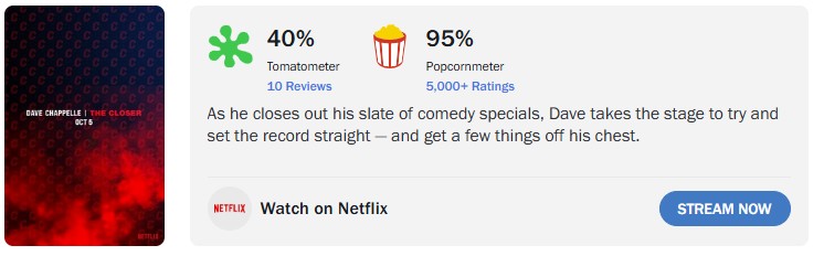 The recent Dave Chapelle show ‘The Closer‘ (October 2021) ruffled a lot of feathers. Intrigued, I had a look at the reviews of the stand-up show. Oh Boy! Was I in for a surprise when I checked the Rottentomatoes ratings between the ‘so-called critics‘ (10 Reviews: 40%) and ‘regular‘ audience (5000+ Reviews: 95%).