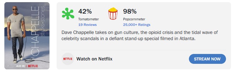 I also checked on Chapelle’s earlier show ‘Sticks and Stones‘ and, again, what a contrast between the ‘so-called critics‘ (19 Reviews: 42%) and ‘regular‘ audience (25,000+ Reviews: 98%).
