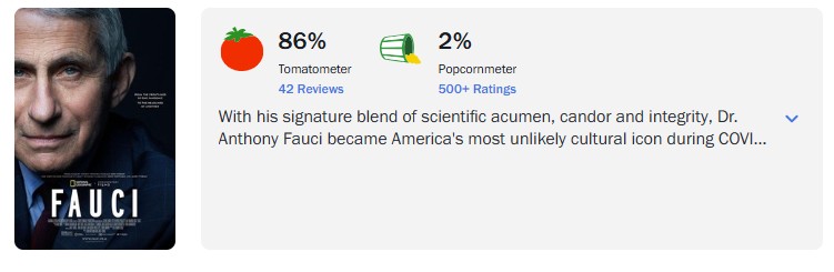 If you thought that the difference was huge with Chapelle’s show, the documentary of Anthony Fauci, ‘Fauci‘ is an even larger yawning gap between the ‘so-called critics‘ (42 Reviews: 86%) and ‘regular‘ audience (500+ Reviews: 2%).
