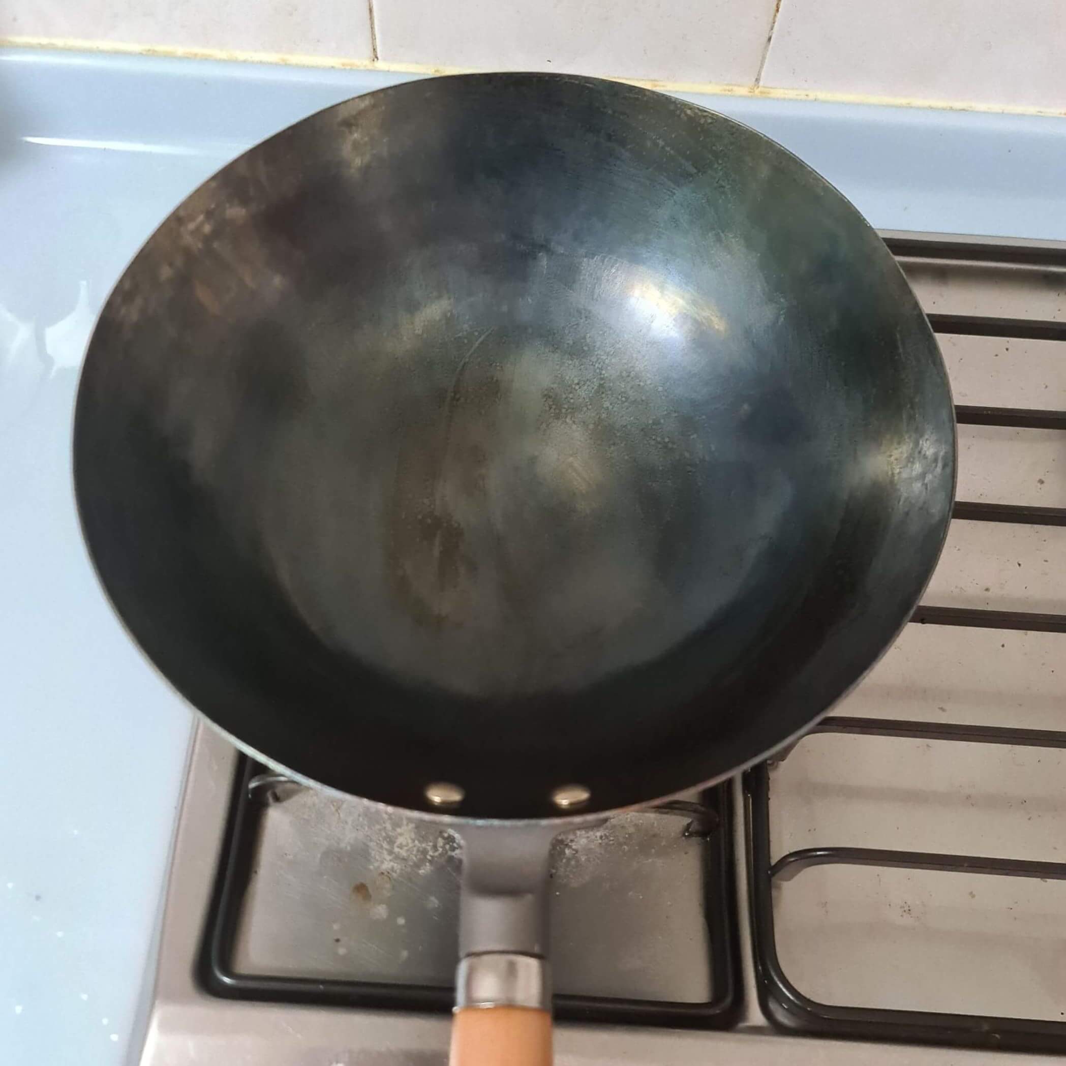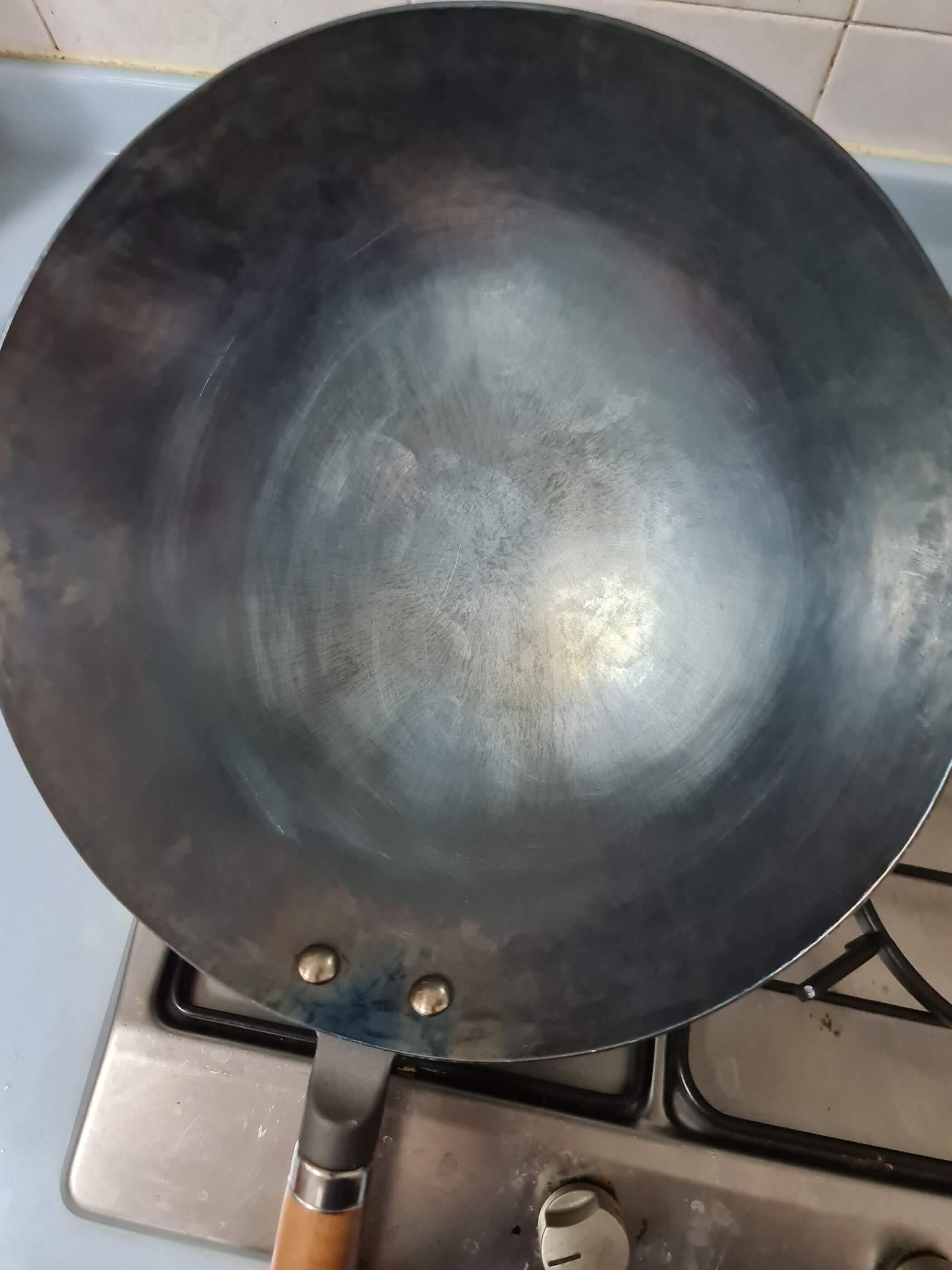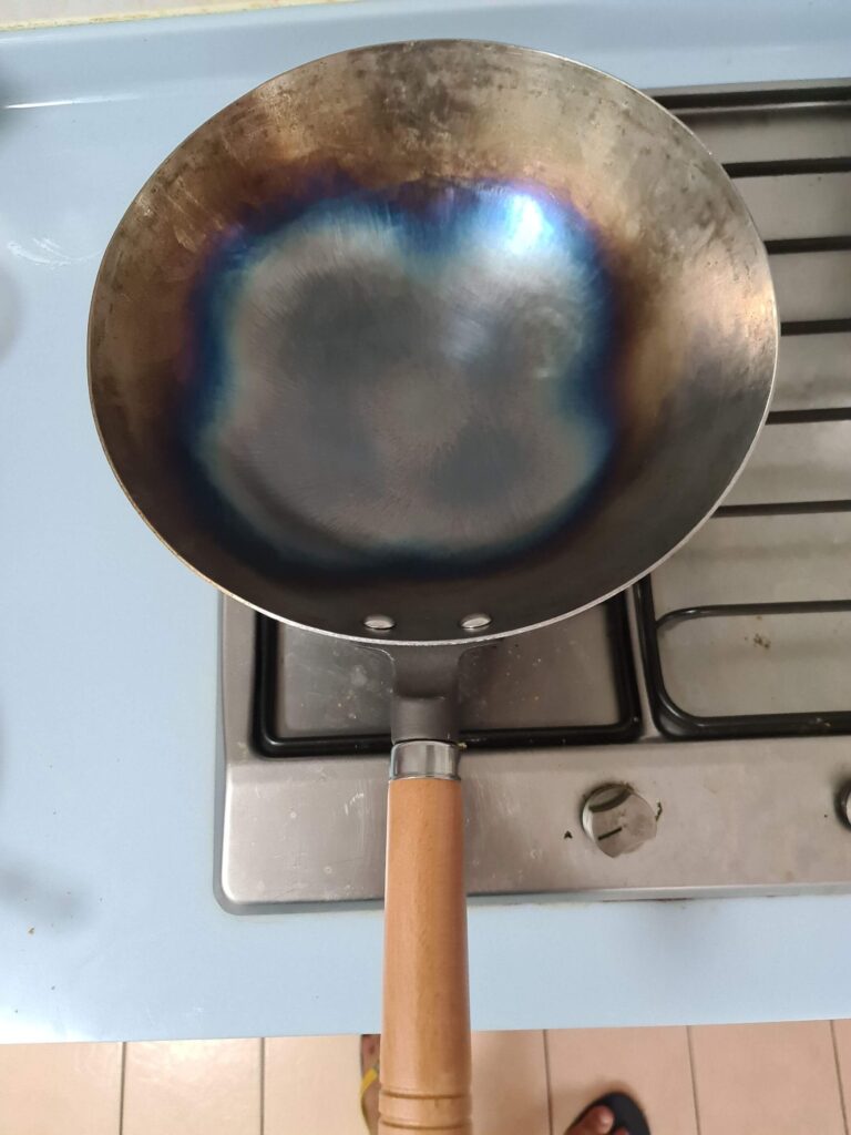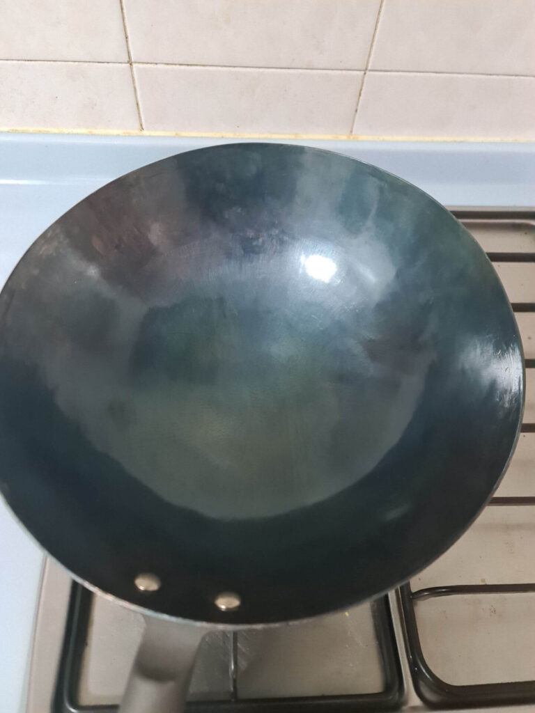 At the end, the wok should be properly seasoned. With the repeated application of oil and re-heating, the wok will end up with a beautiful blackish-blue patina colour (image below).