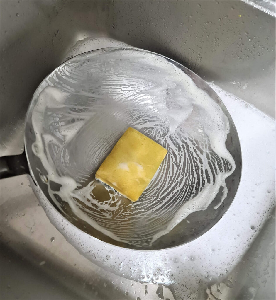 1. Wash off the layer with warm-to-hot water, regular dishwashing soap and dish scrubber. Clean thoroughly both inside and outside surfaces and wash it off with warm-to-hot water (Be careful when using hot water). Let the wok dry completely.
