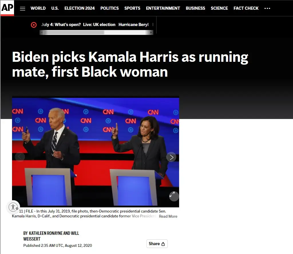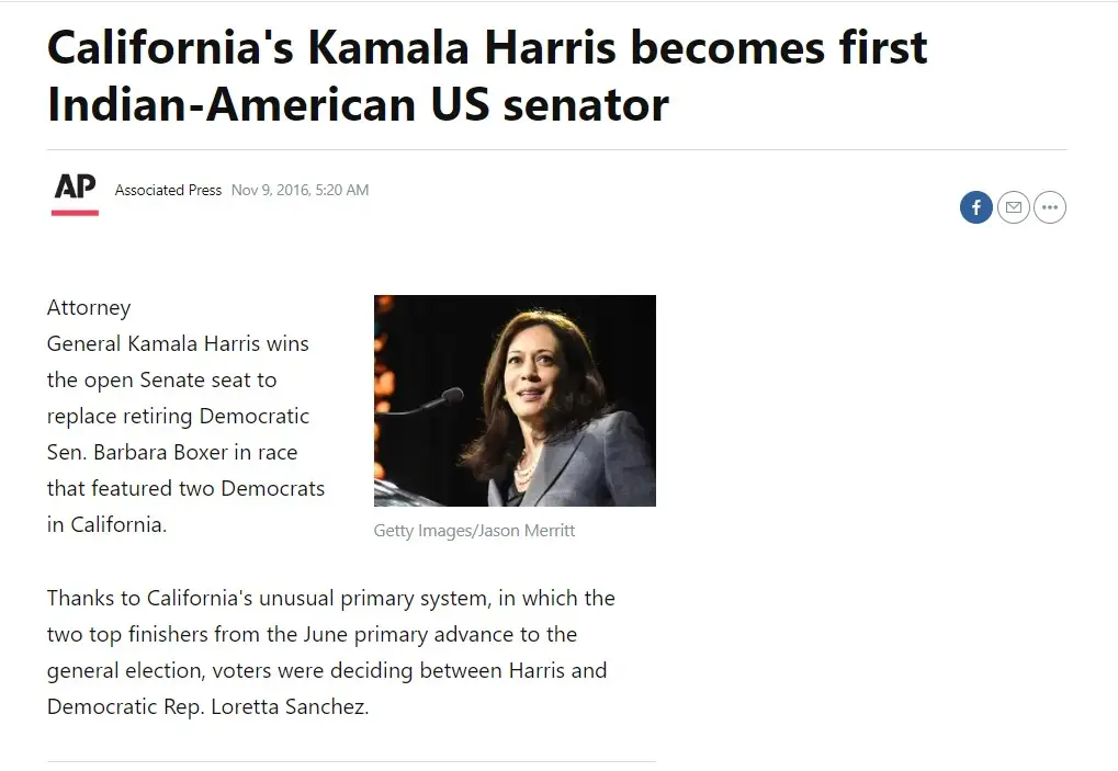 In 2016, the Associated Press (AP) posted an article titled ‘California’s Kamala Harris becomes first Indian-American US senator‘ (archived) (Nov 9, 2016). Almost 4 years later (July 31, 2019), another article the AP article was changed to ‘Biden picks Kamala Harris as running mate, first Black woman‘ (archived).