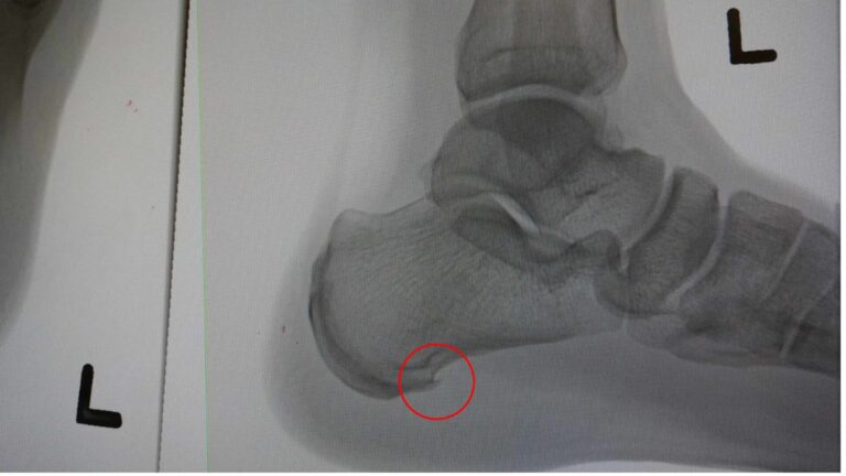 It got so severe for me that I had to get a jab at my heel after consulting a Orthopedic doctor. Just to let you all know, having a needle inserted at the heel is such an involuntary butt-clenching moment. I guess there is a direct nerve connection between those two part of the body. Below is an x-ray of my right foot with the protruding spike (below in red circle) that causes the pain while walking.